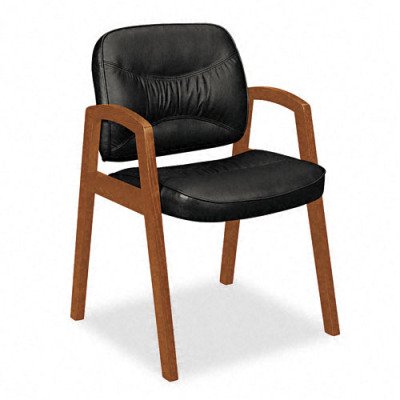 Guest chair offers an affordable wood and leather solution that is ideal for smaller offices. Pleated stitching detail in the black leather upholstery provides a professional appearance. Wood frame construction provides durability and strength. Design also features gently curved wood arms and a four-leg base. Seat size is 22" wide x 19-1/4" deep. Back size is 21-1/4" x 18". Guest chair does not stack and meets or exceeds ANSI/BIFMA safety and performance standards.