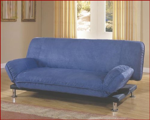 This sofa easily coverts into a bed by moving the seat back down to a horizontal position. It features a durable 100% micro-fiber covering and has an adjustable arm or pillow feature. Shown in blue.