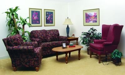Chair and Loveseat:Loose cushion back and seat, reversible cushions, roll arm, spool turned wood feet.Wingback Chair:Fully upholstered, loose “T”cushion seat, Chippendale legs with stretchers.Available in different finishes and configurations. Call your sales professional.