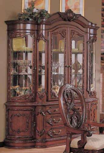 This collection of elaborate carvings and careful detail brings forth the kind of beauty reserved only for the Master dining room. Each piece is constructed from birch solids and veneers in a rich brown finish. The china cabinet features drawer stops with three can lights, a dust cover and touch light. Create an exquisite dining room with the Nottingham collection, and bring a traditional elegance to your home. This buffet hutch china cabinet makes your dining room experience conveniently simple. The set is crafted in a traditional design with cherry veneers, birch solids, and a refined brown finish. It includes an easily accessible corner dining hutch with a china cabinet offering plenty of shelf space for your dishes and stemware, while the fine glass doors allow you to put your fine kitchenware on display. The set also includes a contemporary dining buffet containing several storage drawers for your silverware and other kitchen items. Three can lights, a dust cover and touch light is also featured. Features: Refined brown finish Elaborate carvings and cabriole legs Traditional style Each piece is constructed from birch solids and veneers Drawer stops 4 glass doors 2 glass shelves 2 wood doors 3 storage drawers Specifications: Overall dimensions: 95.75H x 22D x 76.75W inches