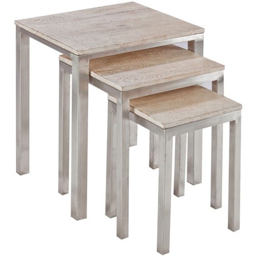 The Bradenton Nesting Tables will add contemporary style to any room. These lovely nesting tables boast a silver metal finish with natural rustic wood tops that will enhance any decor.