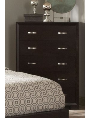 Trendy and modern, the Astrid Collection adds flair to any contemporary bedroom. From the espresso finish to the accenting bi-cast vinyl insert on the headboard or chrome hardware, this collection exudes the attitude that defines the style. Bold solid hardwood arched legs support the platform bed, while recessed beveled edging cleanly frames each case piece.