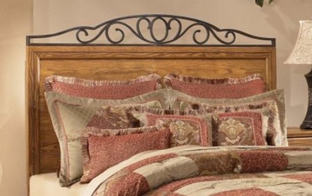 The Rosalie Panel Headboard creates an elegant relaxing environment for any bedroom decor with the rich Old World beauty of the scrolling metal accents and warm finish. The warm golden brown finish flows beautifully over the replicated oak grain, enhancing the generous scaling and shapely bracket feet cut-outs and perfectly capturing the craftsmanship of Old World design. With the scrolling beauty of the bold metal accents finished in a dark brown with subtle gold color highlights, this headboard is a shining example of Old World Beauty. Bring a classic, beautiful design to your home with the Rosalie Bedroom Collection.