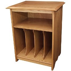 Crosley ST47-OA Features: -Handcrafted hardwoods and veneers -Hand rubbed finish -Wood shelf -Wood dividers for record storage -Oak finish -Light assembly required -Overall dimensions: 25" H x 19" W x 15.25" D This handcrafted wood entertainment stand proudly displays your favorite turntable or Crosley Entertainment Center in any setting. Constructed of hardwoods and veneers, this stand comes complete with a wood storage shelf and dividers perfect for storage of books, magazines or even records.