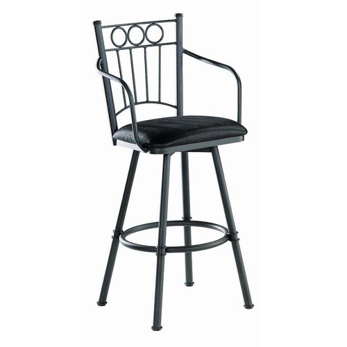 Charles II 26"+(Chocolate)(Natural Back)(Bamboo Terracotta) Finish: Chocolate, Wood Back: Natural, Seat Type: Fabric - Bamboo Terracotta Pictured with Crocodile black fabric and a black metal finish Features: -Armrests for added support.-Durable and efficient welding joints.-Memory swivel option.-Optional solid birch wood seat.-Lead-free, environmentally safe, non- toxic paint.-High-temperature baked powder coating.-Product as pictured may vary slightly from swatches. Construction: -Heavy-gauge steel. Assembly Instructions: -Easy assembly of base, swivel, seat, and back using 6-8 screws. Dimensions: -Wood seat height: 25''.-Upholstered seat height: 26''.-Arm height: 32.5''.-Overall Dimensions: 42'' H x 22.75'' W x 24'' D. Warranty: -Residential application warranty is 10 years on metal structure and 1 year on fabric.-Commercial application warranty is 1 year on metal structure and 1 year on fabric.-If commercial application is not chosen, stools used in business will only have a 30 day warranty. Disclaimer: -Please note, Trica requires a signature on all residential deliveries.
