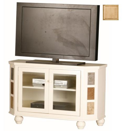 The Flagstaff collection fits todays comfort lifestyle. Recessed doors, inset slate tile panels and solid wood mouldings provide a clean style that is complemented by a choice of painted or rich stained finishes. Color: European Gold. 2 Glass Panel Doors. 1 Fixed Wood Shelf. Tile Accents. Bun Foot Base. Dimensions: 27-1/2 H x 45-3/4 W x 17 D.