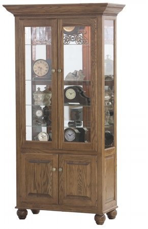Distinctive between production and pride, the Heirloom Collection was crafted with attention to detail with the best solid woods and veneers in order to proudly showcase memories amd collectables for decades. Color: Sandy Oak. Lighted. 2 Glass Panel Doors. 4 Adjustable Glass Shelves. 2 Doors. Mirror back. Mirror Bottom. Finished Top. Plain Base. Dimensions: 76-3/4" H x 40" W x 18-1/2" D.
