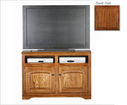 The Oak Ridge collection combines American oak hardwood with updated contemporary styling. Heavy crown moulding, sleek lines, fluted side moulding, black brushed metal hardware, solid oak frames and solid oak recessed doors give this transitional collection. Color: Dark Oak. 2 Raised Panel Doors. Style will coordinate with your existing décor. Units feature cable management system in the back. Recessed panel doors on the lower cabinets provide closed storage. Open DVD shelf located in the center of the unit for convenience. Solid wood construction ensures quality and durability. Constructed from Amercian oak solids and veneers. Black brushed metal hardware complements the wood grain. Bracket style feet and fluted side molding add to the updated style of this collection. Dimensions: 32 H x 45-1/2 W x 17 D.
