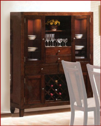 This collection is crafted from select hardwoods with birch veneers in a beautiful walnut finish. Chairs come with a foam microfiber cushion seat for comfort. Matching china with wine storage and two outer glass doors offering plenty of storage shelving. The table measures 60?L x 42?W and includes one 18? extension leaf and a storage base.