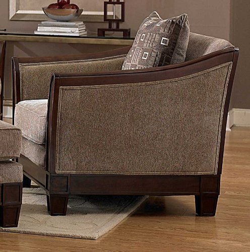 Serving up sophistication, style and comfort, the Trenton Collection adds the urban elegance you are looking for in your living space. A neutral textured chenille body cloth is accented by a coordinating geometric pattern and solid scatter pillows. The exposed wood frame in a rich cherry finish further enhances the sophistication by adding a more complete look. This uniquely designed sectional sofa is complemented with a coordinating chair and ottoman. Trenton is a comfortable yet sophisticated addition to any home. Dimensions: