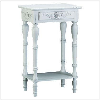 Shaped legs and shell-design trim add distinction to this square side table. A generous drawer and a bottom shelf provide plentiful storage. Wood with distressed white finish. Assembly required. 17 3/4" x 13" x 28" high.
