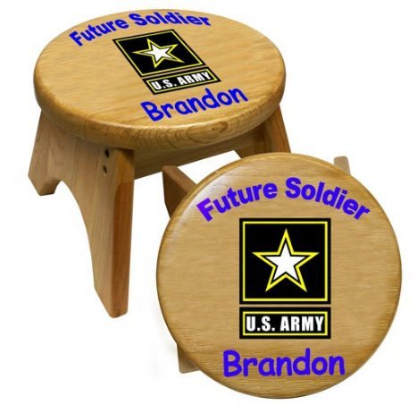 HZ9325+ Letter Color: Blue Features: -Army stool. -Stand at attention soldier. -Children will love this classic. -Great gift for that special child. -Looks great in any room in the house. -Wide base prevents tipping. -Legs are screwed together for extra strength. -Ages 18 months and up. Specifications: -Material: Hardwoods. -Overall dimensions: 7''H x 10'' Dia.