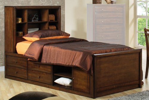 Scottsdale Bookcase Bed by Coaster 400280. The Scottsdale Collection is offered in either a twin or a full chest bed which includes the wood rib support. This youth collection if offered in a rich deep walnut finish with bevelled wood fronts on all drawers accented with brushed brass hardware. The bookcase chest bed features 4 drawers with an open shelf section and storage under the bookcase. Chest section can be used on either side of the bed. Metal on metal glides. Specification This item includes CO-400280 Scottsdale Bookcase Bed Twin 88.5L x 41W x 50-25H, Full 88.5L x 56W x 50-25H Please refer to the Specifications to determine what items are included since sometimes the image shows more or less items. If you are not sure, please contact us and our customer service will be glad to help.